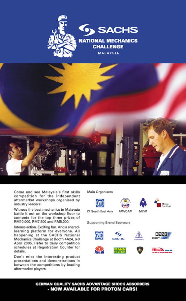 Using that as a starting point, I continued to develop a concept for a “live” skills competition in a trade fair setting which eventually became an even bigger success story. In 2005, the Sachs National Mechanics Challenge was held in Malaysia in a trade fair called Automechanika Asia and a new marketing platform for the company was born.