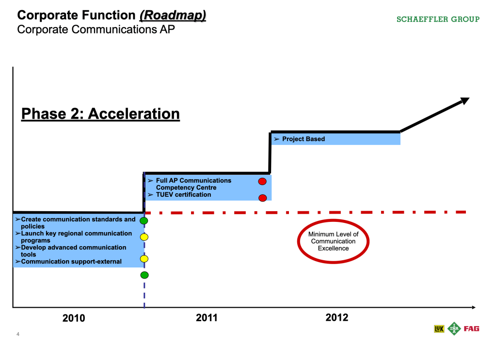 Communication roadmap prioritised with two phases and three focus areas. Based on these discussions at multiple levels, I developed a team vision that everyone felt being a part of and facilitated them to develop a three year communication roadmap from 2009 to 2012. The roadmap was divided into two phases of stabilisation and acceleration and focused on the following three key areas (see above as well):
