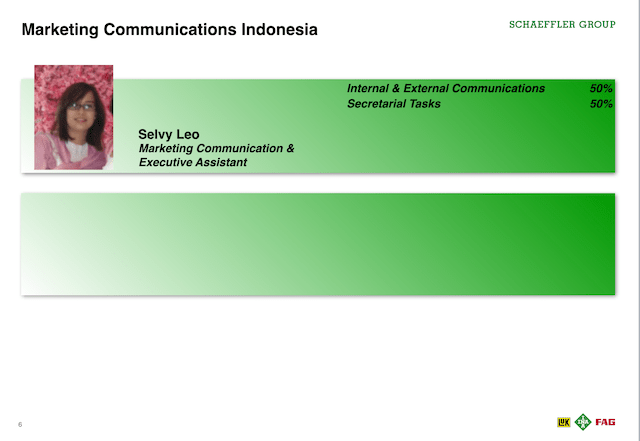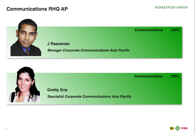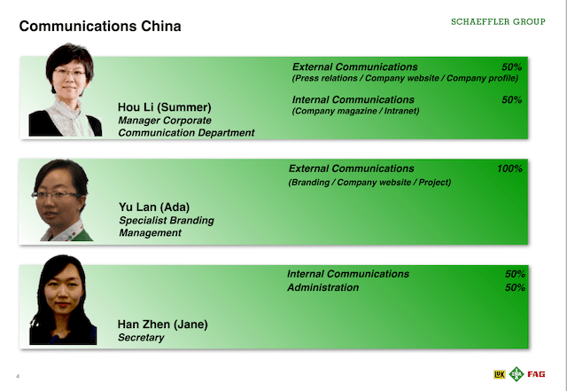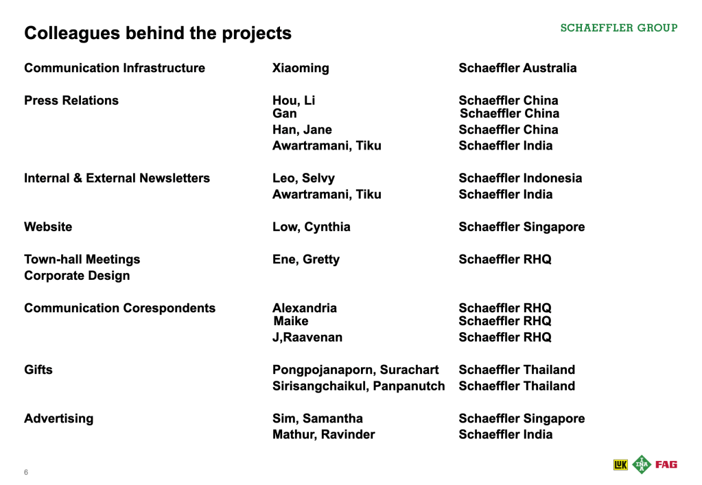 Found a reliable partner in Schaeffler China. Schaeffler China had the largest and most experienced communications department in the Asia Pacific region. I therefore naturally partnered with Schaeffler China communications colleagues often when brainstorming and discussing next steps for the Asia Pacific region. I encouraged them to share their experience and knowledge and to help their mates and colleagues in the region.