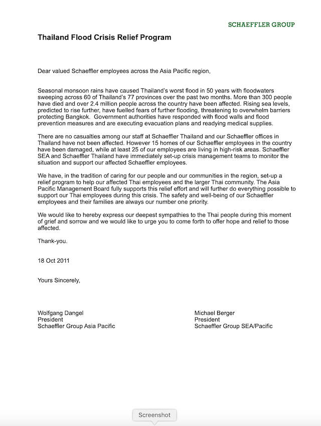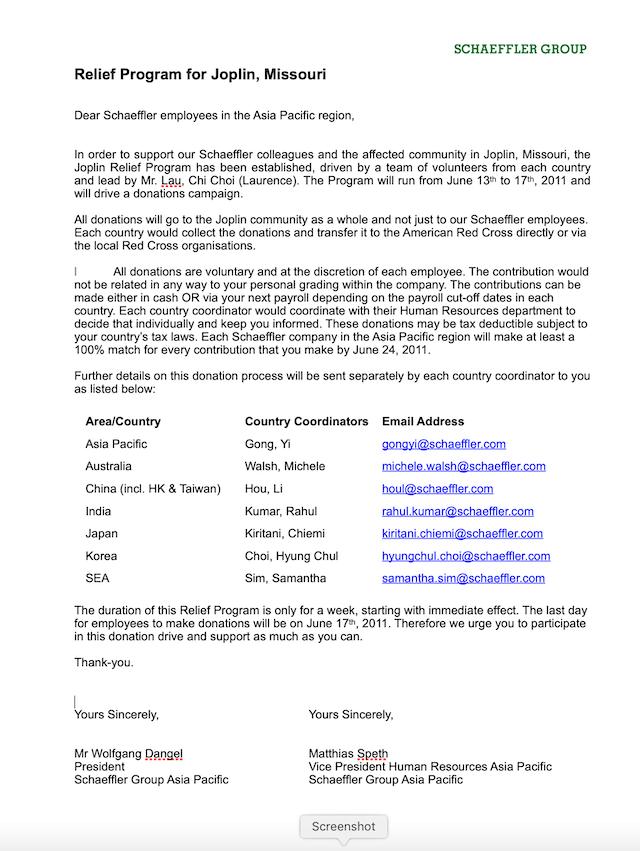Schaeffler companies around the world were requested to support the Joplin Tornado disaster relief. Our APAC President had close ties to USA and wanted to support the Americans in some ways. A donoation drive as conducted in the APAC region, not only to support Schaeffler employees in the affected areas but all Americans. Thus I wrote and circulated letters requesting employees to support in the relief program (see below).