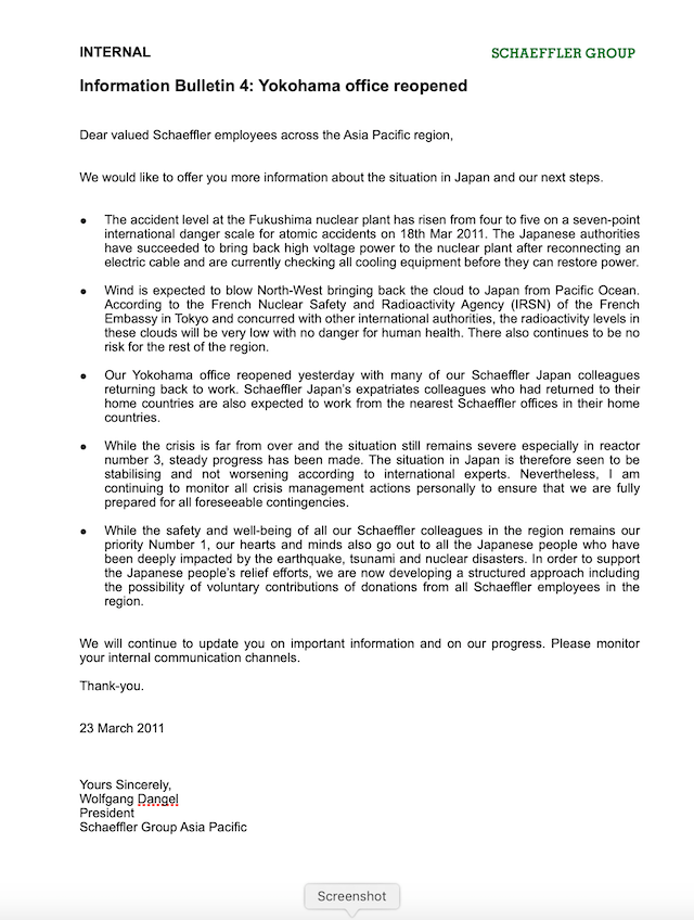 Schaeffler Asia Pacific set up a dedicated room in Shanghai office to manage this crisis. It was headed by our APAC security manager and I joined the team to lead the crisis communications for about three weeks, away from my daily work. As the crisis unfolded, we followed up on news channels, did extensive research on contamination by radioactive winds and monitored weather reports especially wind conditions. We also sent out regular internal bulletins (see above) to our employees in Tokyo and ensured that they received words of encouragement and motivation from leadership in Japan as well as from APAC office until the crisis situation subsided about four weeks later.
