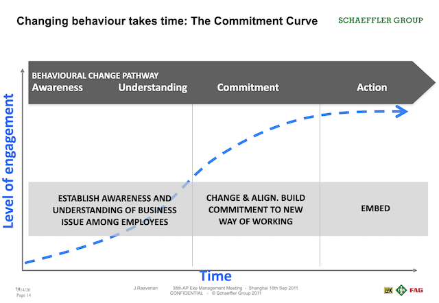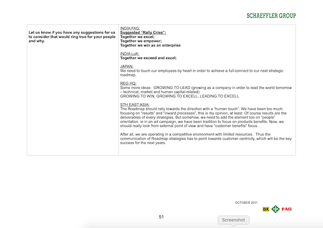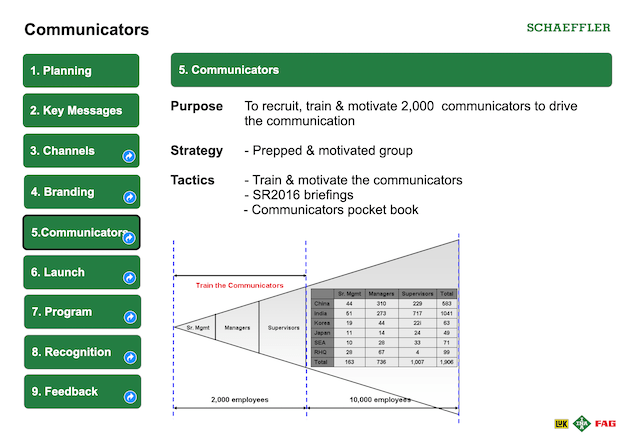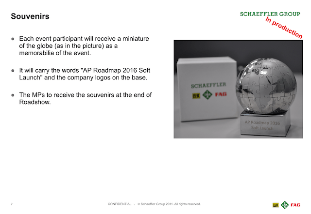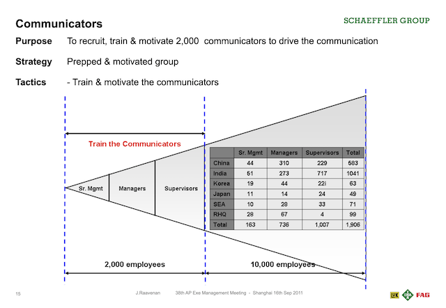 The Schaeffler companies in Asia pacific organised other own launches with an agreed window period of one month. Each of the Schaeffler companies came up with their own creative event concepts but used the branding, key messages, staff packs and program outline developed by us in APAC communications. For example, in Japan which had only one office with not more than 100 staff, the President decided to have the launch as a morning breakfast event in a single location. Whereas in China, the launch was decentralised and held in 28 different plant and office locations country-wide on different days. A similar approach was also followed for Schaeffler India as it also had many plant and office locations. Unfortunately I was not able to get hold of the photos of the launch events from the different locations in Asia Pacific.