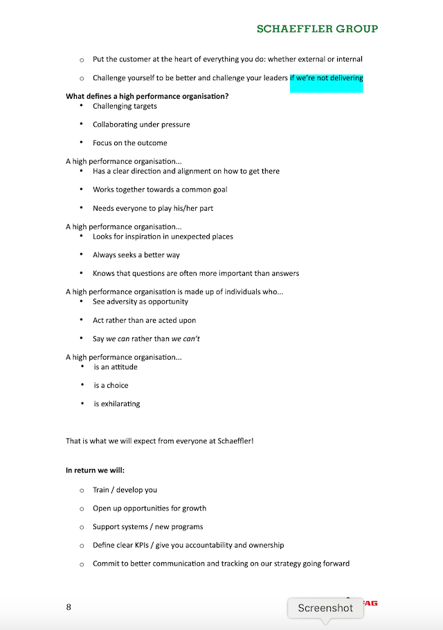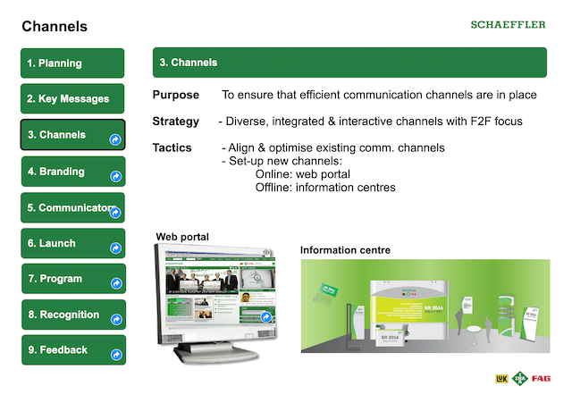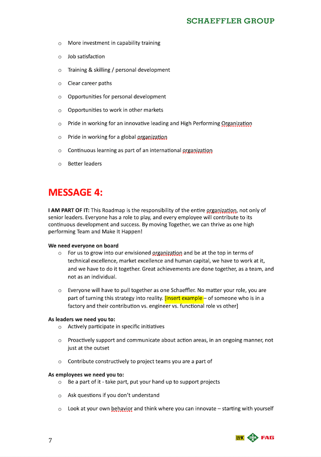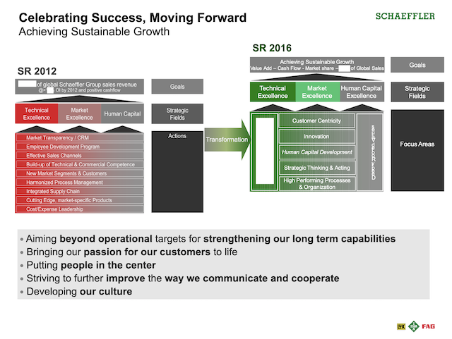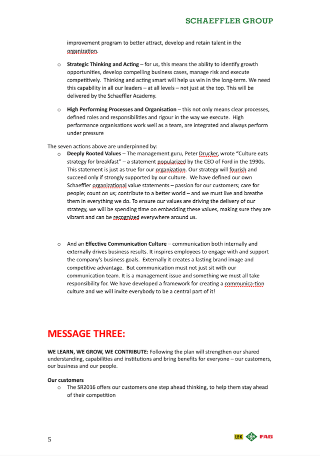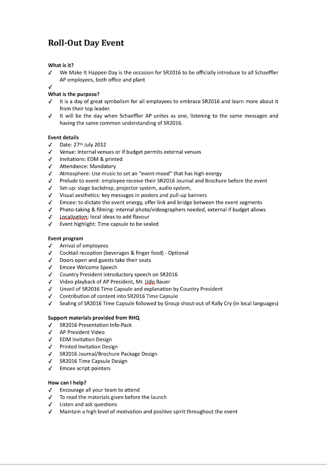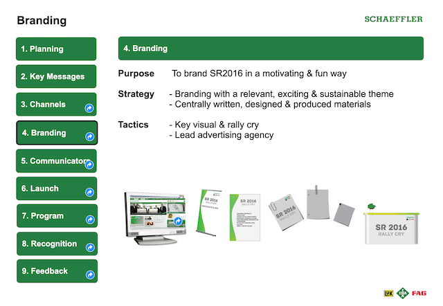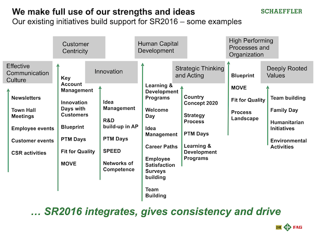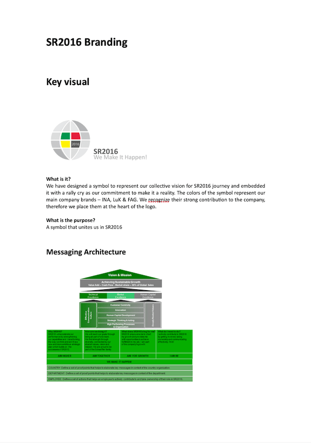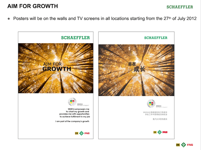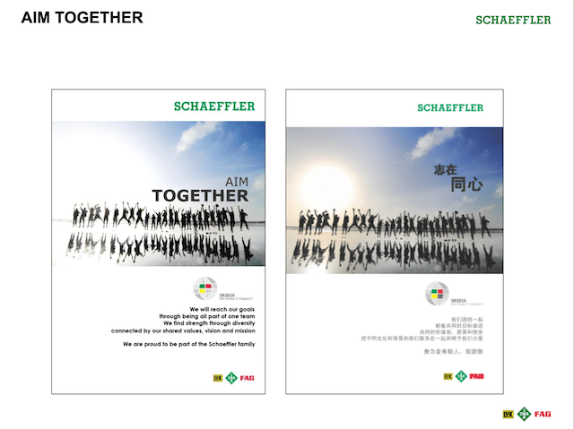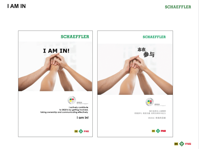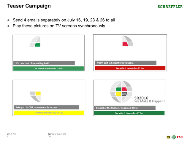 We developed a globe logo with three colours representing the three product brands of the Schaeffler Group. My team ingeniously created the rally cry “We Make it Happen” (see below). The launch day was eventually known as “We Make it Happen Day”. The rally cry eventually became very popular with the leaders and staff of the company, especially as the last sentence spoken after a speech or presentation.