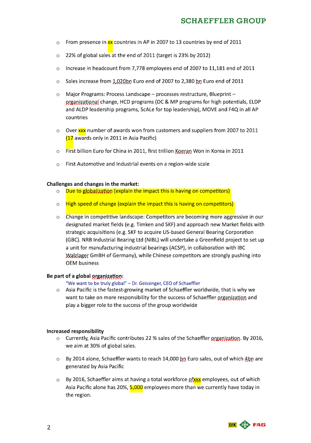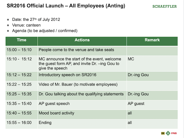 The company’s management developed its five year plan and called it “Strategy Roadmap 2016” or “SR2016” for short. My task was to develop communication strategies and plans which can be used by all Schaeffler companies in the APAC region to roll-out the strategic roadmap into their markets. I was also tasked to offer them all the support that they needed and I was also in the lead to roll-out the plan for the APAC managers and staff at the APAC regional headquarters itself in Shanghai. I worked on this project with my newly hired APAC managers for internal communications, press relations, trade fairs and events and digital media.