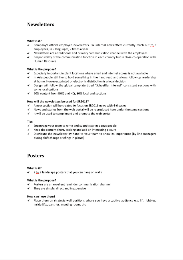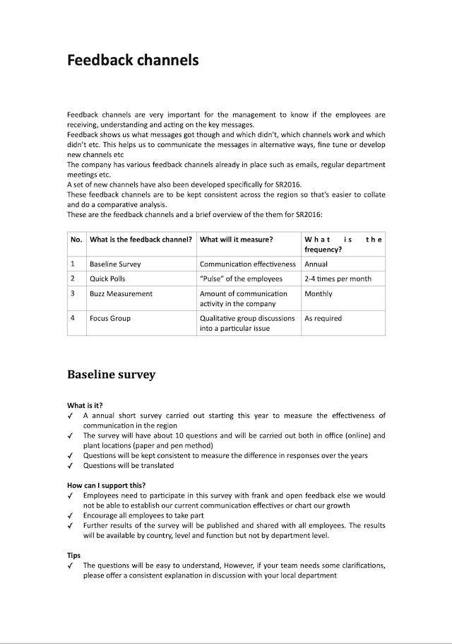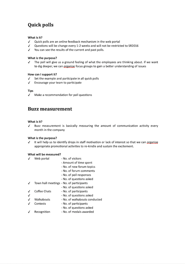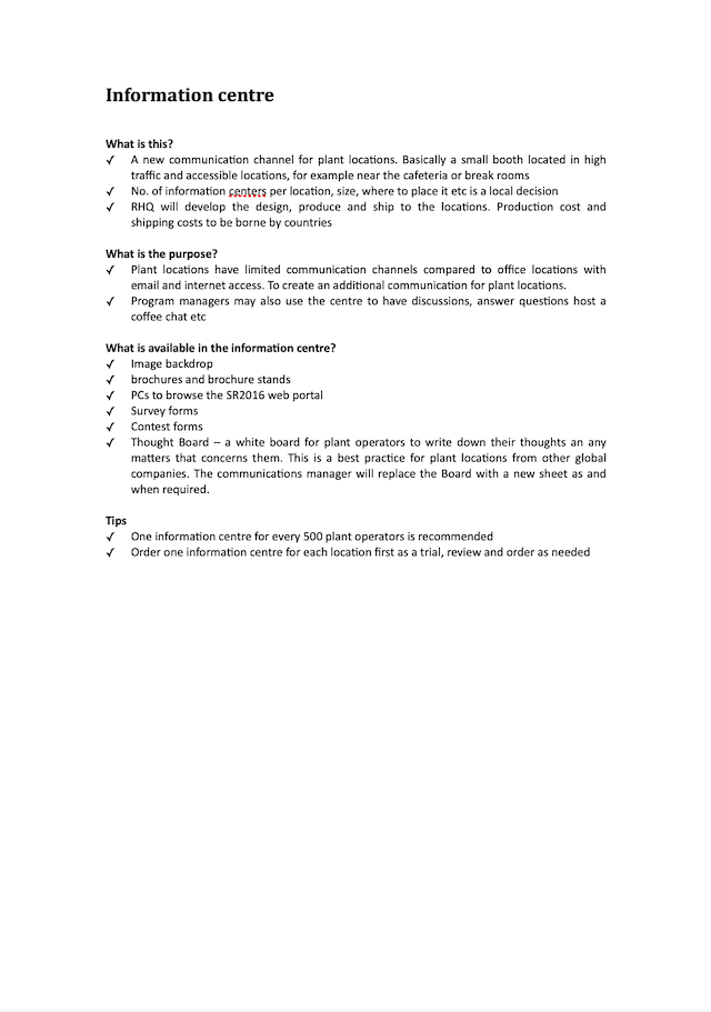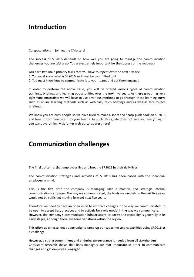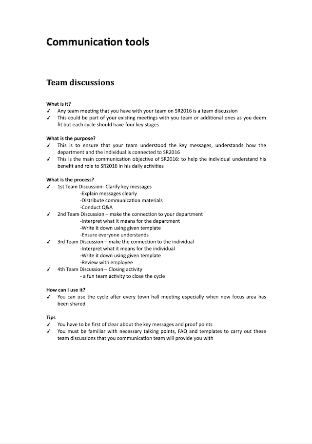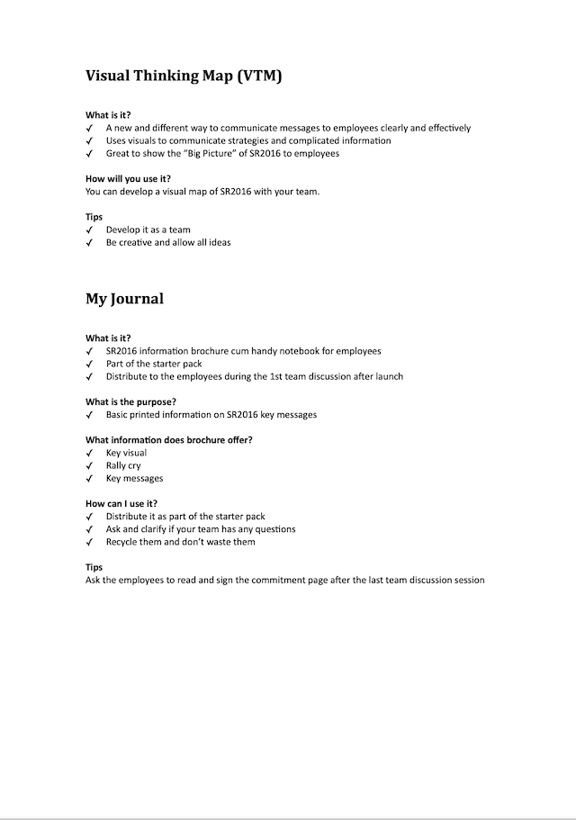 On of the communication strategies that I developed was to built and leverage upon an army of communicators to drive the strategy communication. I wrote and edited a manual for the communicators with inputs from my team and our agencies. The manual offered essential information to the communicators for them to have interesting conversations with staff. You can see an early version of the communication manual below.