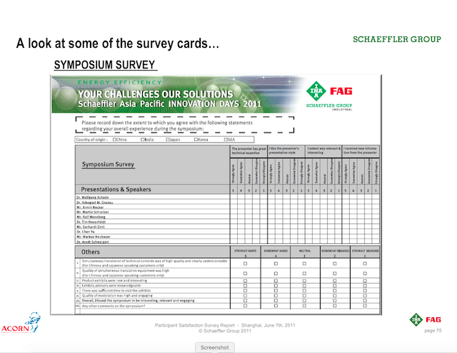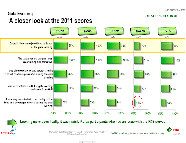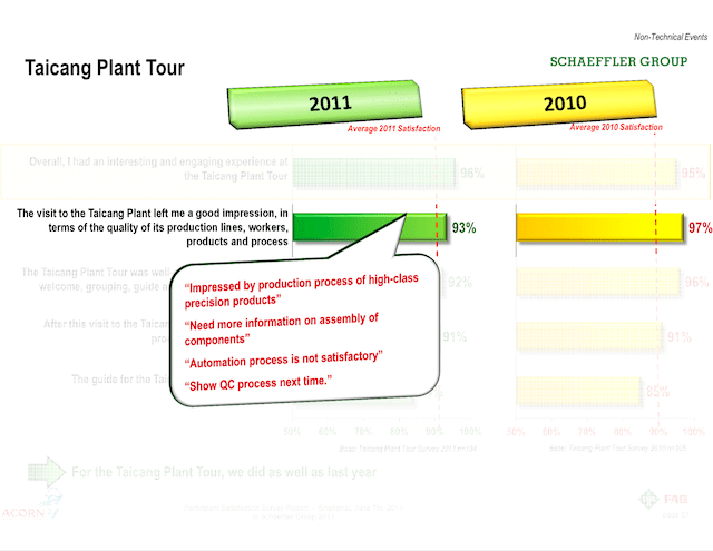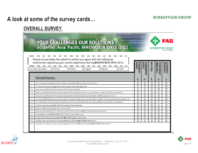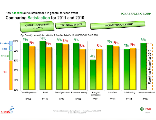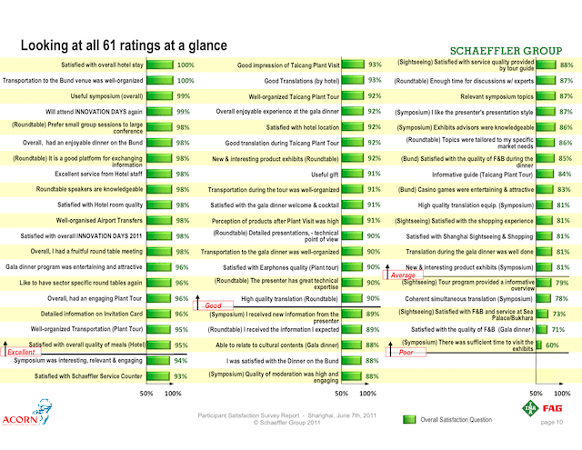 We achieved an overall customer satisfaction experience of 98% compared to the Automotive Symposium 2011 of 95%. Customers rated their hostility experience as 100% which might seem unreal. But considering the depths to which my hospitality team went, I am not totally surprised. They practically visited every single one of the 500 guest rooms to do a final check before the guests arrived.