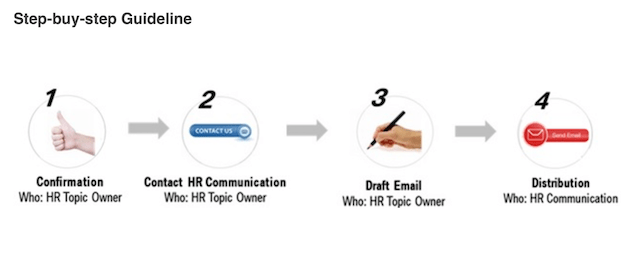 - Yellow lane of communication. These emails though not being of an emergence nature had a time sensitivity. This was subjected to a 3-day gatekeeping process where it was edited and vetted and then distributed out using a newly created email accent: HR Communication.
